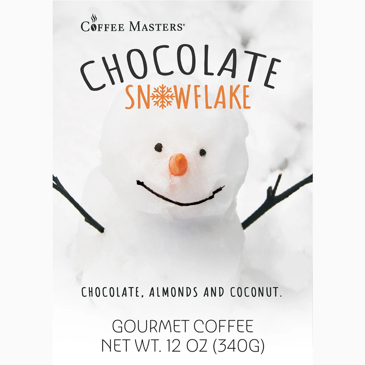 Our Chocolate Snowflake flavored coffee all dressed up in a white valve bag with a holiday themed label. Fresh roasted coffee flavored with the taste of rich chocolate, almonds and coconuts.