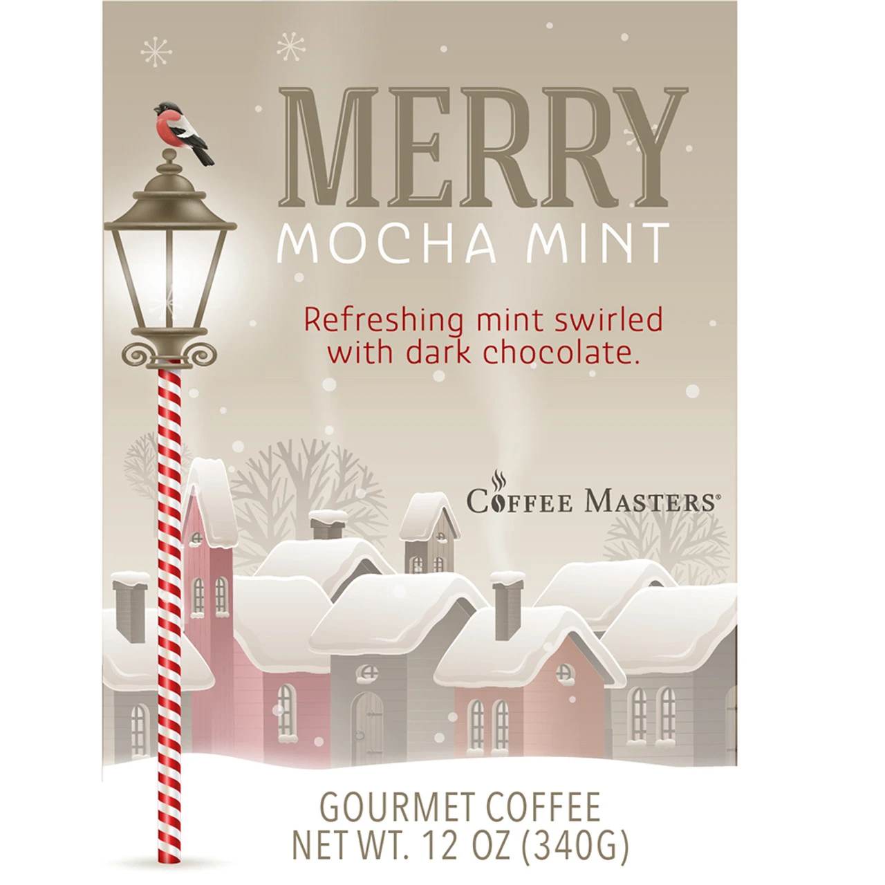 Our Merry Mocha Mint flavored coffee all dressed up in a green valve bag with a holiday themed label. Our fresh roasted 100% Arabica coffee flavored with the taste of chocolate and mint.