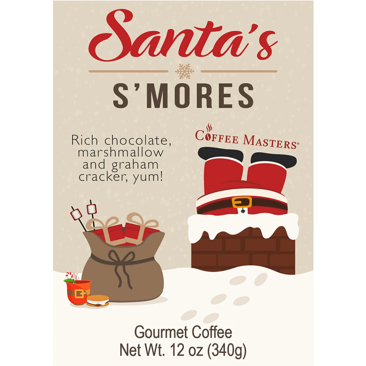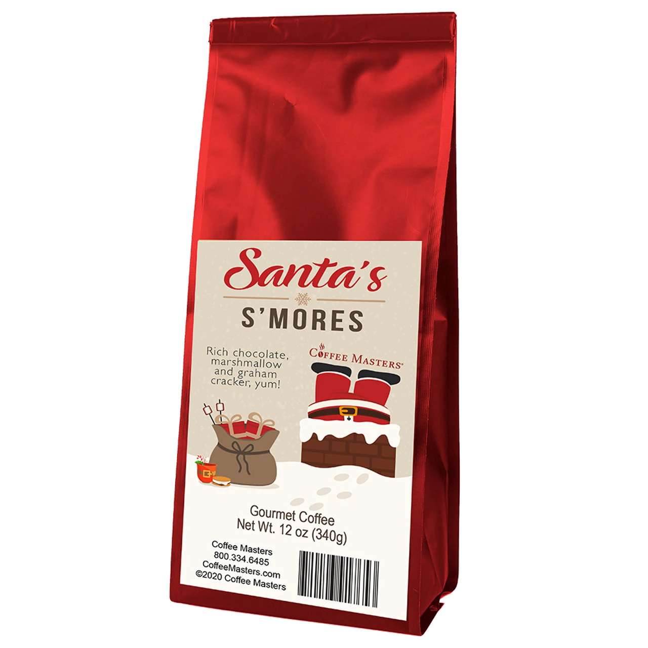 Our Santa’s S’mores flavored coffee all dressed up in a red valve bag with a holiday themed label. Fresh roasted coffee flavored with the taste of rich chocolate, marshmallow and graham cracker.