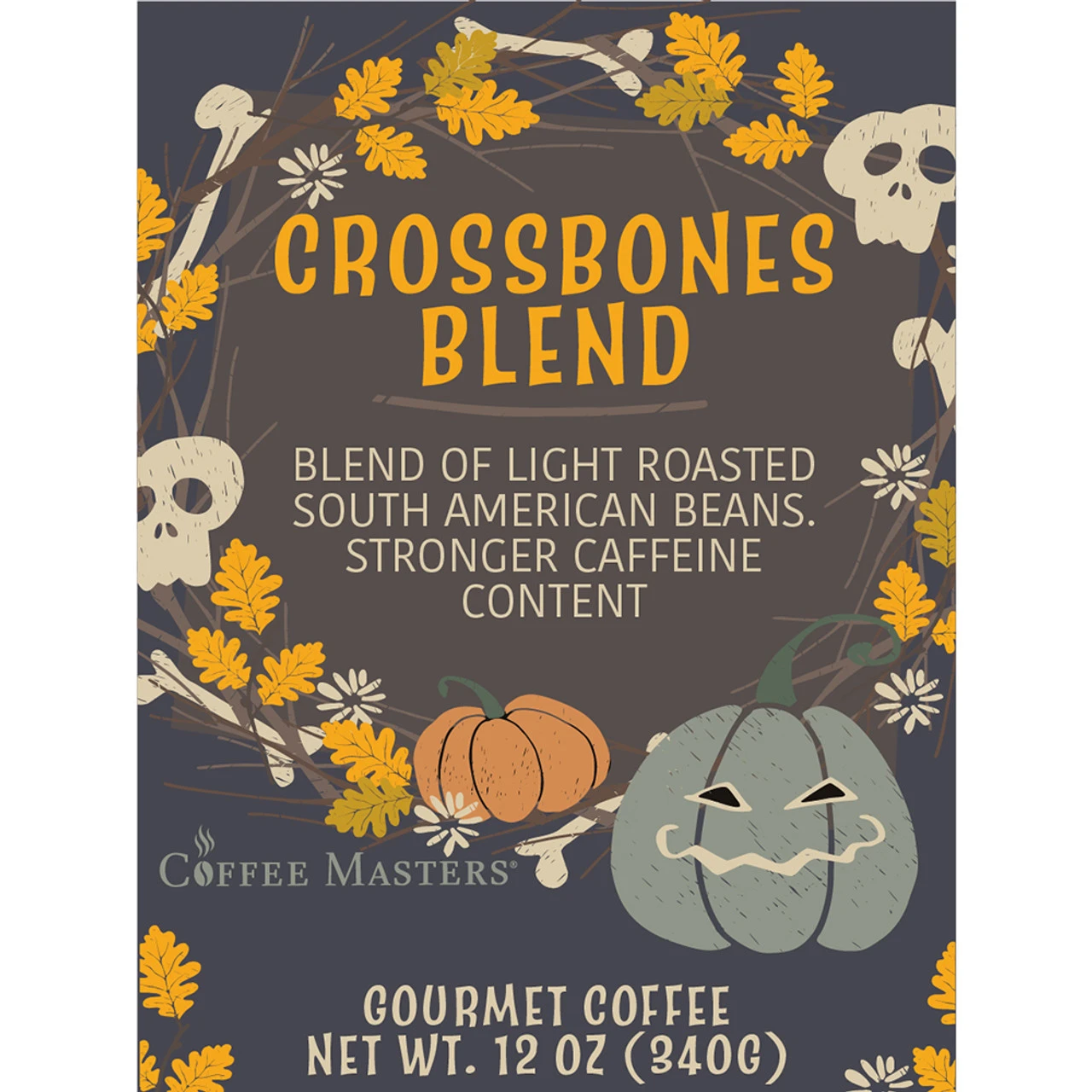 Our unflavored Crossbones coffee in a kraft bag with a Halloween themed label.  A blend of light roasted South American beans. Remember, lighter roasted coffee has more caffeine.