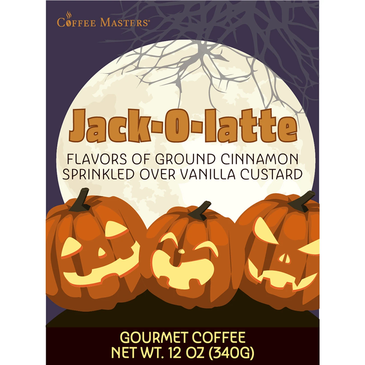 Jack-o-Lantern label design in a kraft bag. Jack-o-Latte flavored coffee: Fresh, ground cinnamon sprinkled over vanilla custard.