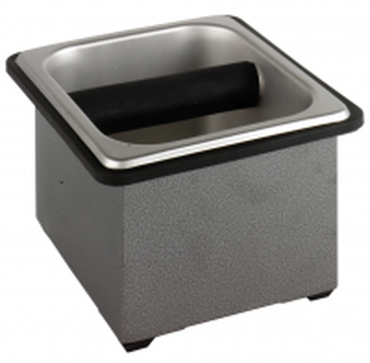 The basic knock box is made with heavy duty stainless steel featuring a welded metal bar for stronger sides combining with the long time industry standard to create a drawn pan with an improved look and build. Each basic knock box has a replaceable rubber bar cover. Knock boxes are designed for commercial use.