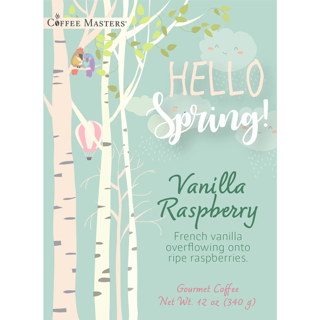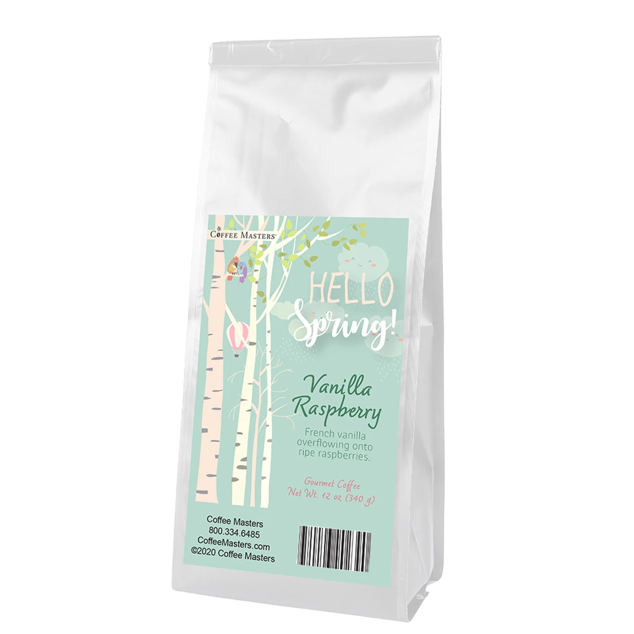 Our Vanilla Raspberry flavored coffee all dressed up in a white valve bag with a Spring themed label. Our fresh roasted coffee flavored with the taste of creamy, rich vanilla and sun-ripened raspberries.