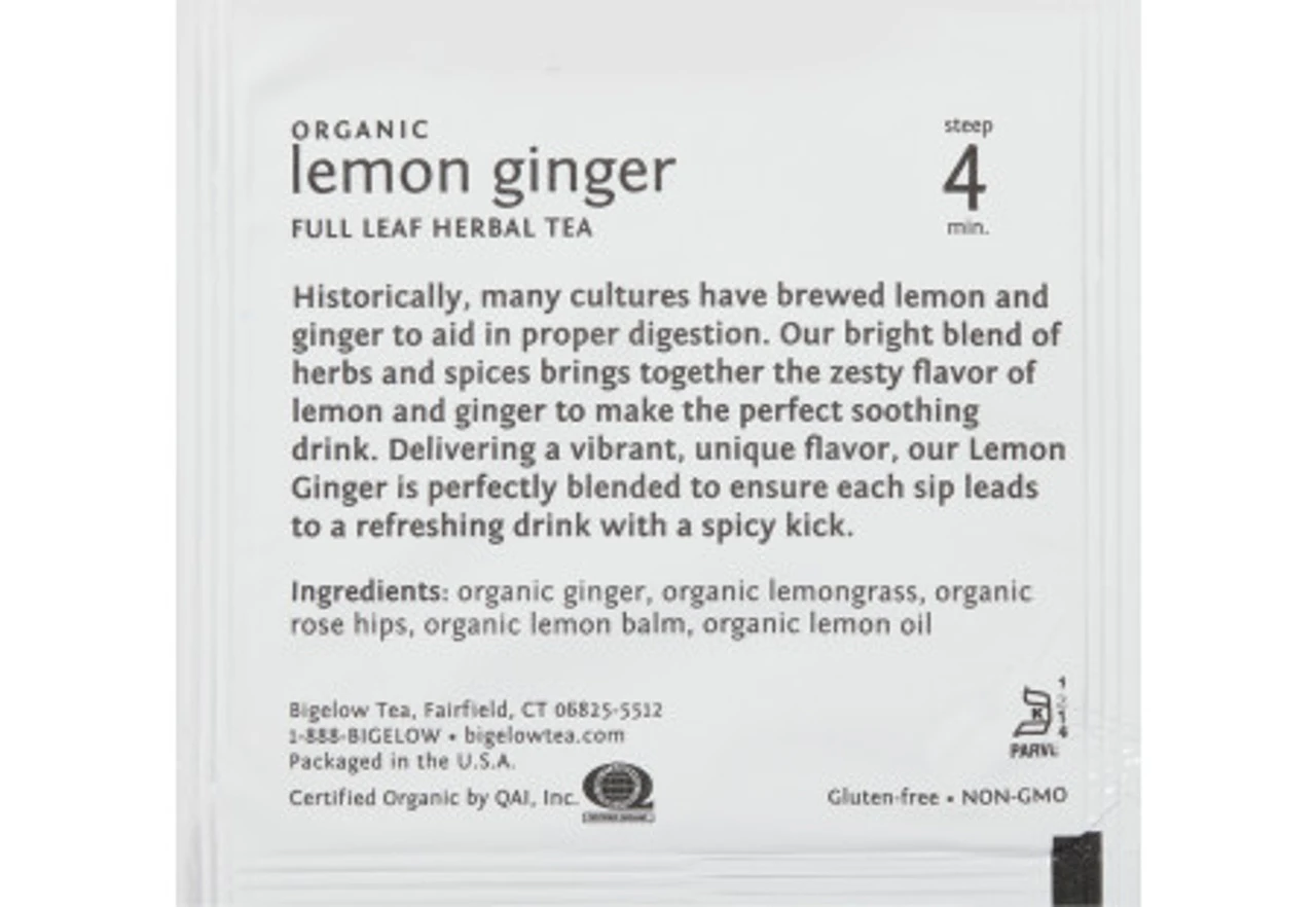 Full leaf organic lemon ginger herbal tea. Our bright blend of herbs and spices brings together the zesty flavor of lemon and ginger to make the perfect soothing drink. Delivering a vibrant, unique flavor, our Lemon Ginger is perfectly blended to ensure each sip leads to a refreshing drink with a spicy kick. Steep 4 min.