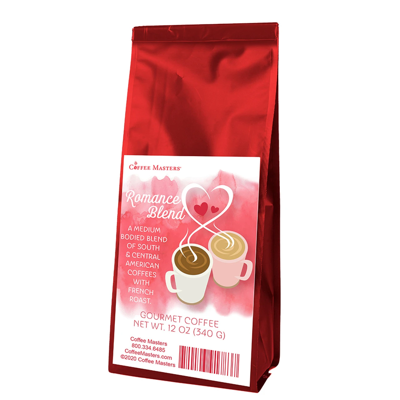 Our unflavored Romance Blend coffee in a red bag with a Valentine themed label. A medium bodied blend of South and Central American coffees joined with French roast.