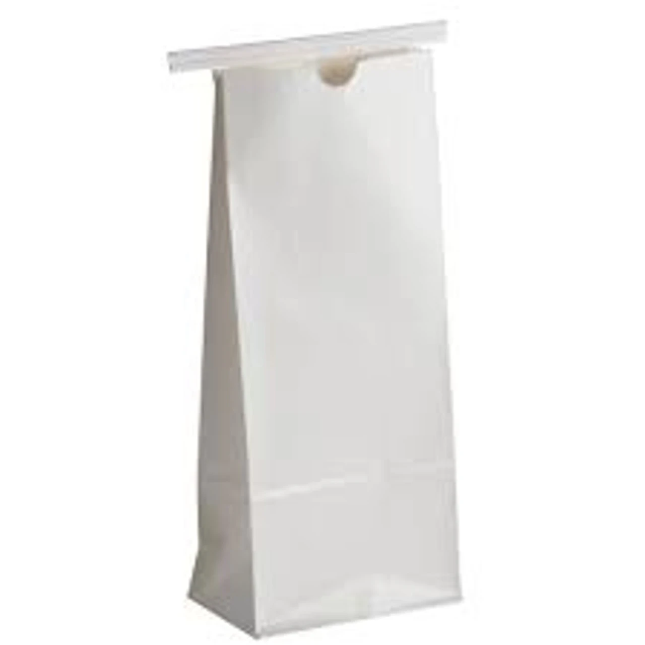 White coffee bags with wire tin tie for closure. Sold in bundles of 100.